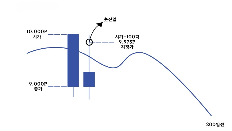 -숏 : B 캔들이 200일 이평 하향 돌파 마감. B캔들 시초가 10,000, 종가 9,000 가정했을 때, B+1 캔들부터 -100틱인 9,975에서 지정가로 포지션 진입(그림4)