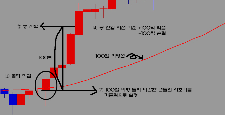 ①롱 진입 : 100일 이평선을 상향 돌파 마감한 캔들의 시초가를 기준점으로 설정, 다음 캔들부터 +100틱에서 롱 포지션 진입.(그림1)