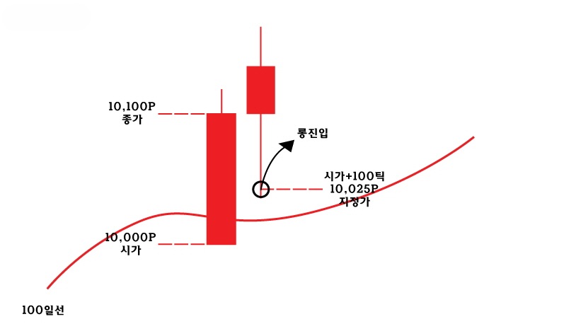 -롱 : A 캔들이 100일 이평 상향 돌파 마감. A캔들 시초가 10,000, 종가 10,100 가정했을 때, A+1 캔들부터 +100틱인 10,025에서 지정가로 포지션 진입(그림3)