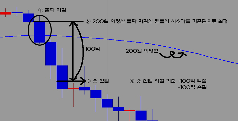 ②숏 진입 : 200일 이평선을 하향 돌파 마감한 캔들의 시초가를 기준점으로 설정, 다음 캔들부터 -100틱에서 숏 포지션 진입.(그림2)