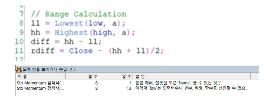 low은 봉의 저가를 리턴하는 데이터예약어 이므로 변수로 사용할 수 없습니다.