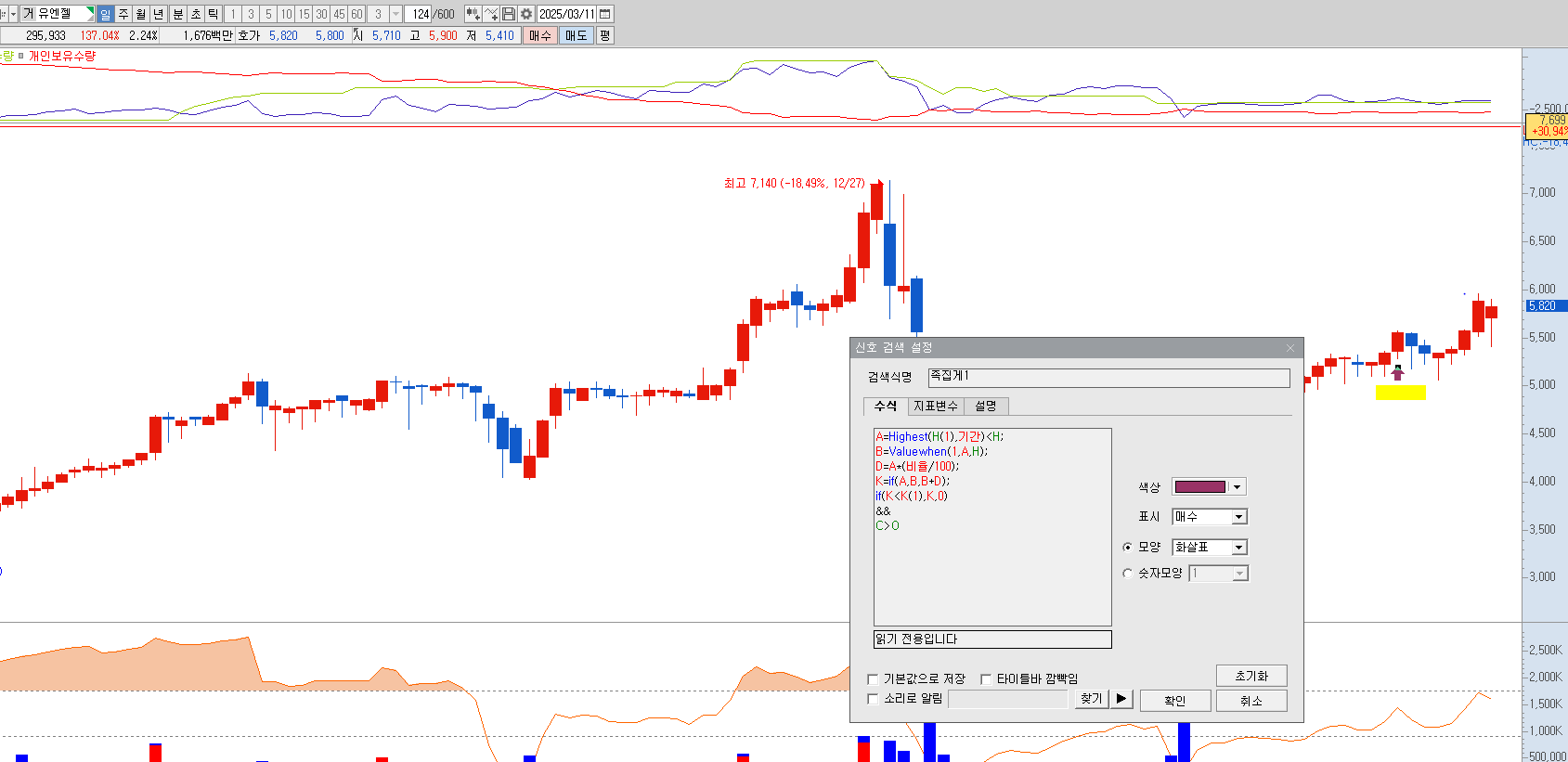 > 검색식에 나오는 종목하고 차트에 신호 발생한 화살표(파일첨부)하고 일치가 되었으면합니다.