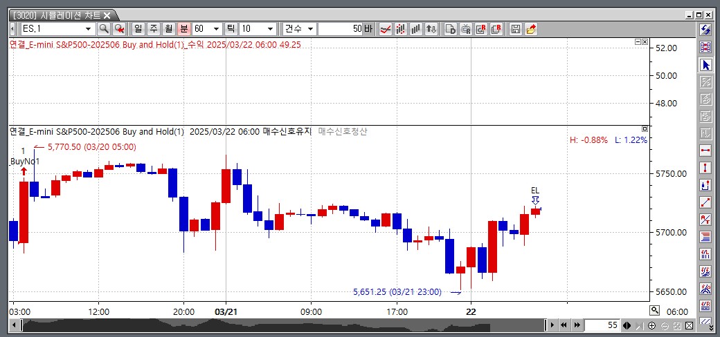 차트에서 보여지는 첫봉에서 매수하고 마지막봉에서 exitlong하는
