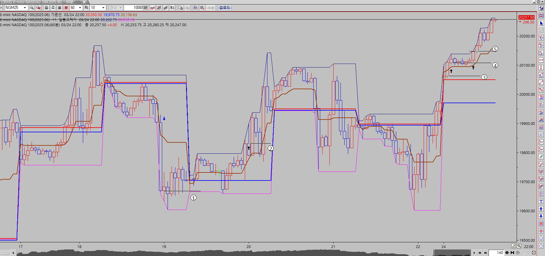 화살표시 된 봉처럼 당일 고가나 당일 저가를 갱신한 후 다음 봉의 시가에 수평선을