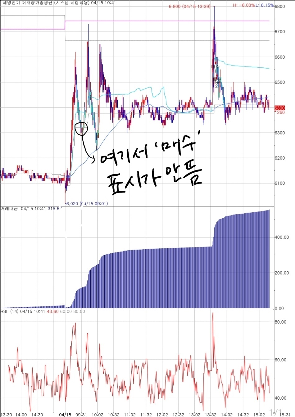 오후 13시가 넘어서야 생뚱맞게 매수표시가 뜹니다. 이유를 모르겠습니다.