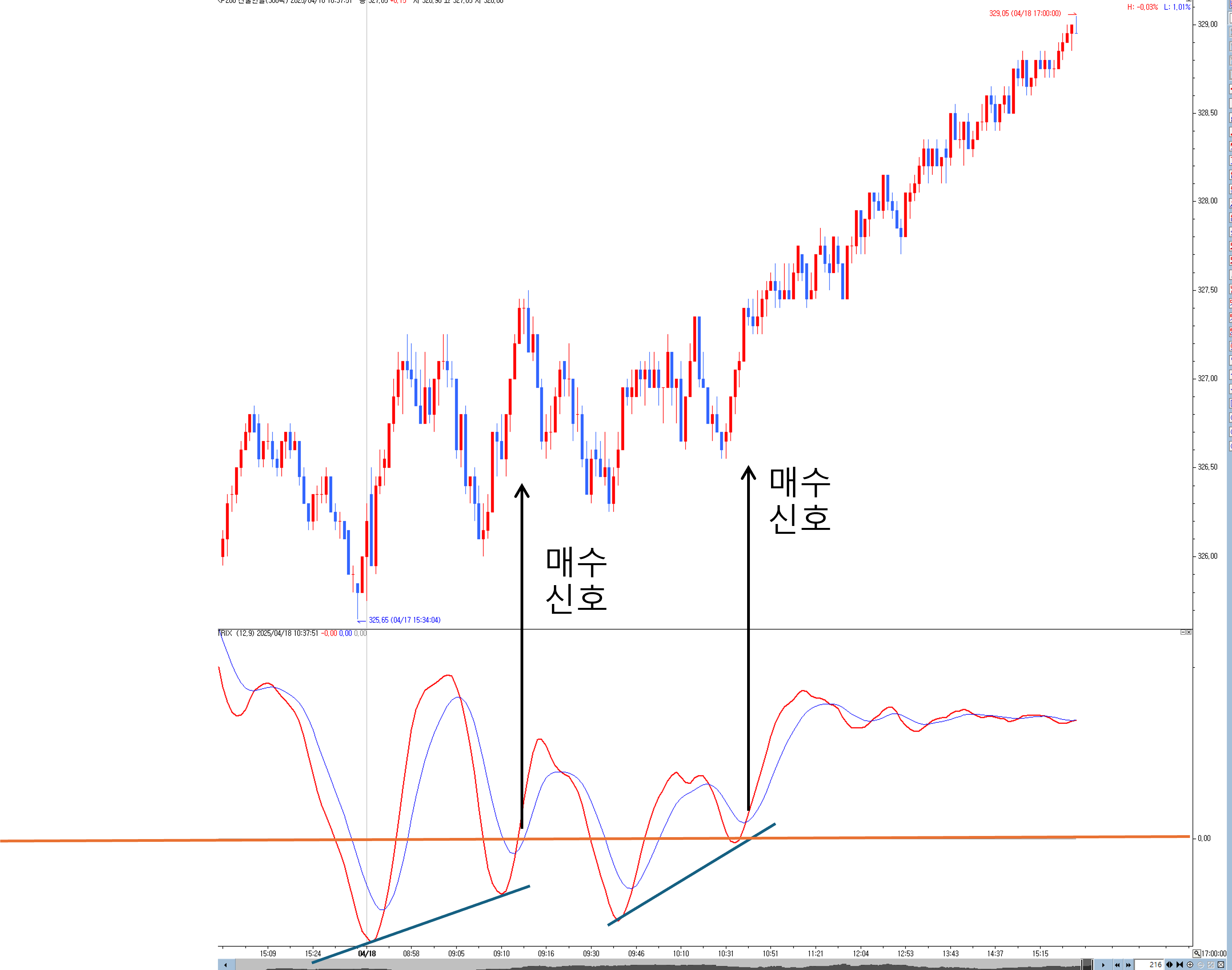 조건이 있는데요... Trix가 크로스업 되기 전 최저점이 0아래일때만 신호가 나오게 하고 싶습니다.