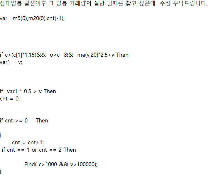 현재봉이 장대양봉 거래량의 절반을 첫번째나 두번째 발생한 봉을 찾는 내용이면