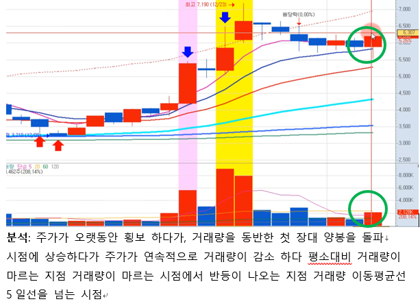 • 조정 기간: 상승 후 주가가 5일 이상 조정(하락)을 받으며 거래량이 감소.
