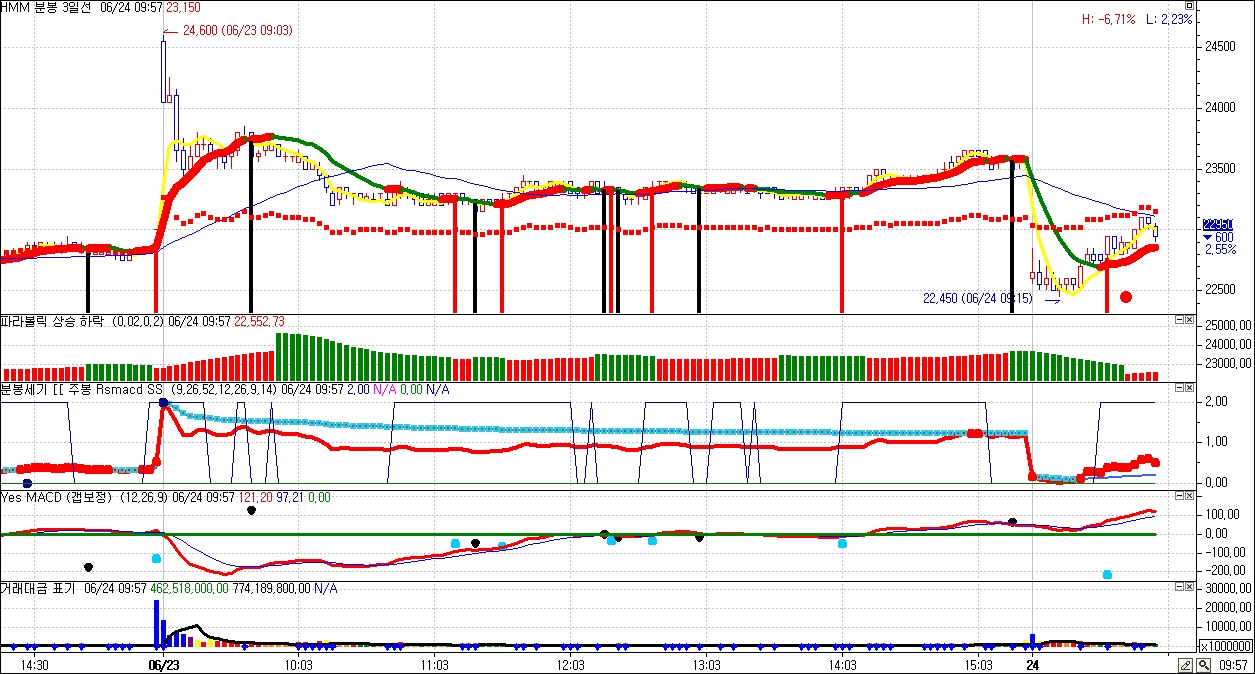 6/24일 HMM 3분봉 차트에 나타난 지표 9시 45분 발생한 빨강 원형 마크