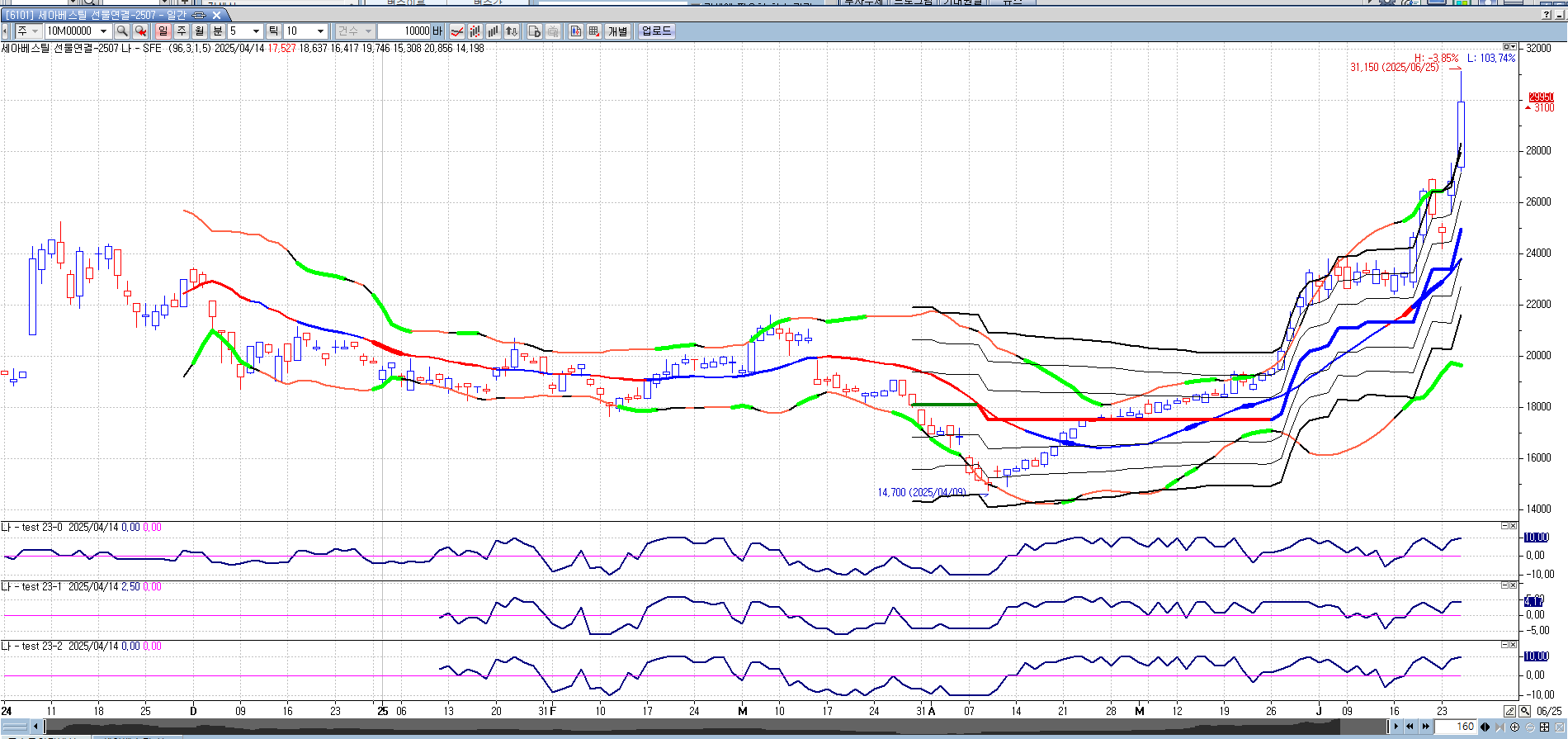 (3) 웃긴 것은 지금의 차트는 세아베스틸 연결 선물인데, 다른 종목으로 바꾸면, 3가지 모두 값이 같게 나옵니다. (2번째 그림) 물론, 지표가 처음 그려지는 것은 사용자 함수로 바꿔서 그리는 것이 오리지날 지표에 비해 여러 봉 뒤부터 그려지는 문제는 똑같습니다. (3번째 그림)