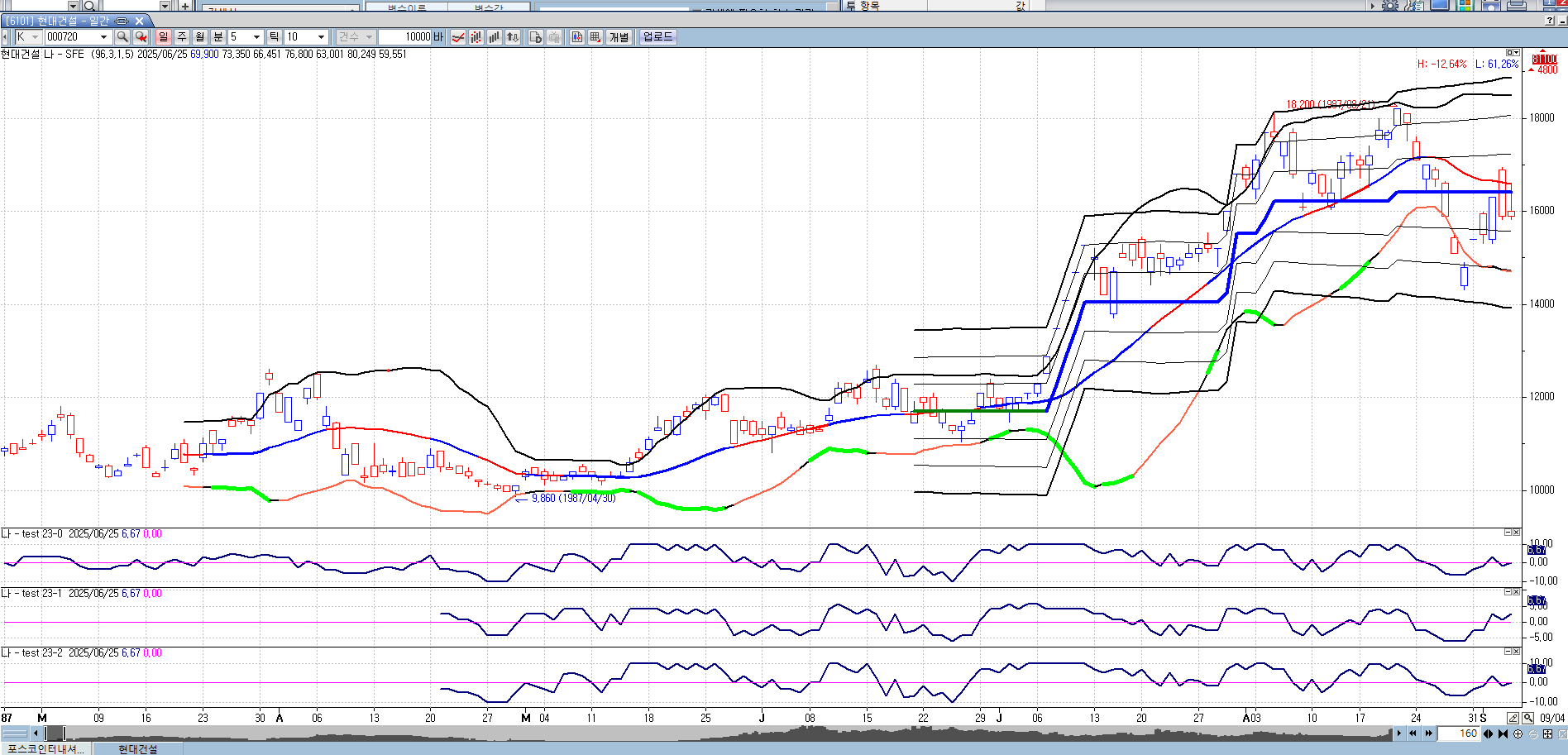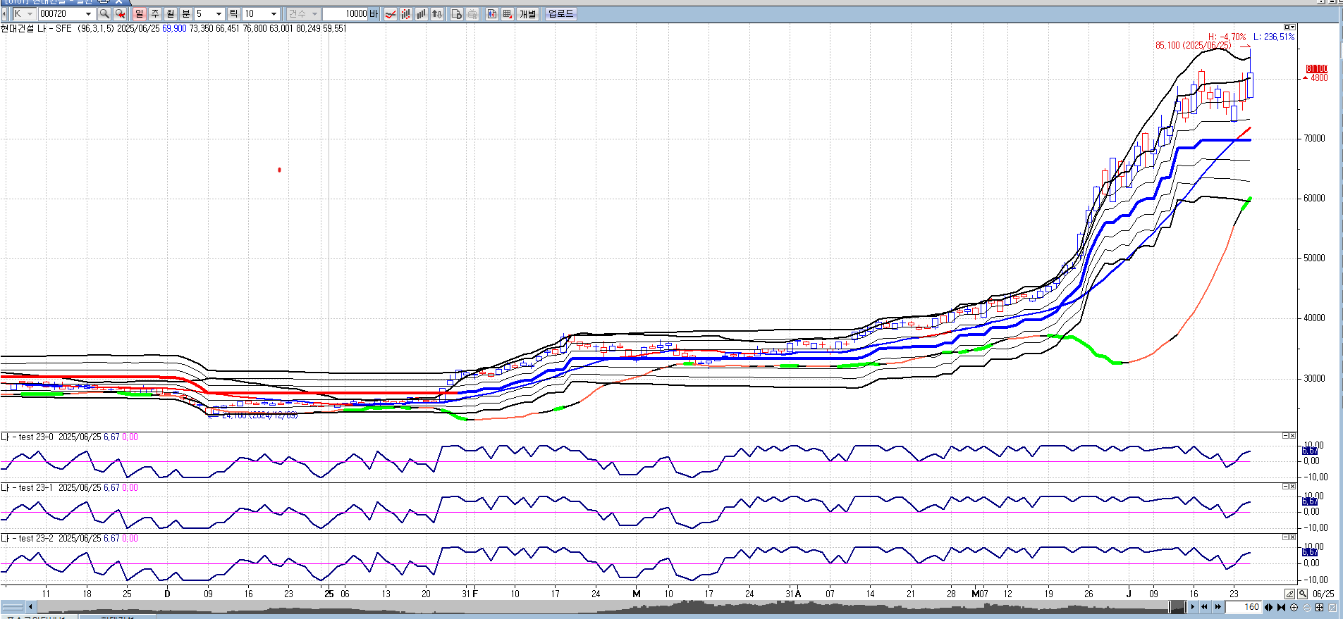 (2) 더 심각한 것은 보시다시피, 지표값 자체가 오리지날 지표인 test 23-0과 비슷은 하지만, 값이 틀립니다. 원래 지표는 -10 ~ 10 의 값을 갖는데, 이 친구는 약 -5,83 ~ 5.83 의 값을 갖는 것으로 보이고, 오리지널은 음수로 바뀌었는데, 이 친구는 아직 양수이기도 하고(25년 5월 22일), 신뢰가 안갑니다. (첫번째 그림)