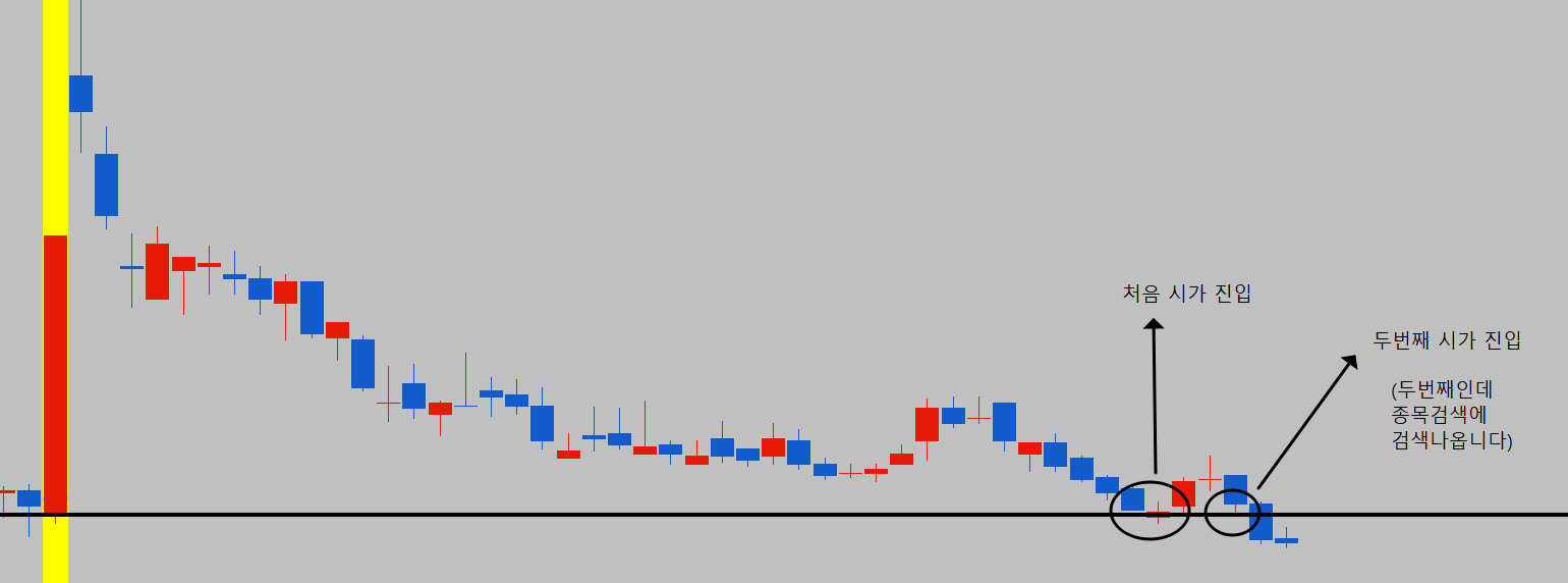 시가는 기준값 위에서 시작했는데 저가는 기준가 아래로 내려간 조건입니다.