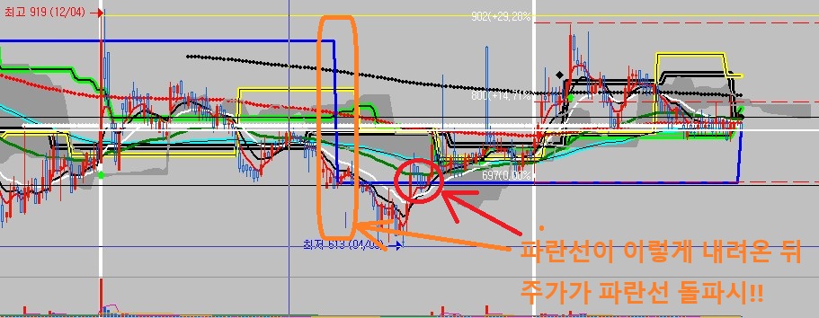 2. 가능할지 모르겠습니다만, 이 라인이 위에 (비싼가격) 있다가 아래로 (싼 가격)으로 내려온뒤에 돌파할 때 (첨부파일 참조)