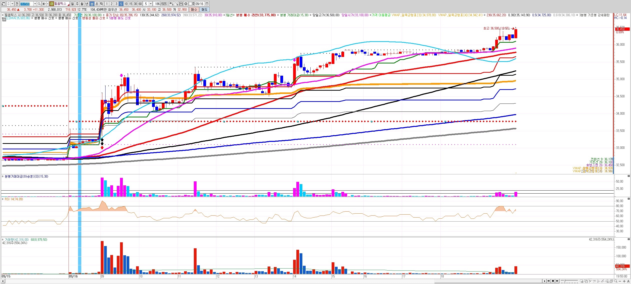 파란패턴 발생하면서 빨간 점선을 돌파할 때 검색기에 뜨는