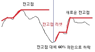 봉차트에서 고점을 선으로 나타내되, 현재 가격이 전고점 대비 60% 이래로 떨어지면