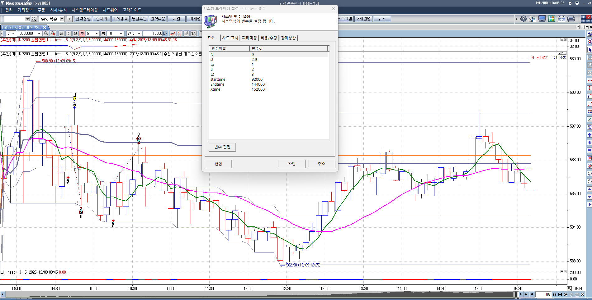 참 그리고, 제대로 작동하지 않습니다. 그림을 보시면, 아래의 지표에서 파란색이 매수신호, 빨간색이 매도신도, 회색은 무포로 있어야 하는 신호인데, N = 9 즉, 하루 9번의 매매를 허락했는데도 매매횟수가 턱없이 모자랍니다. 이 부분도 수정 부탁드립니다.