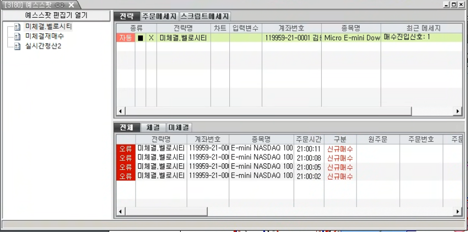 전략의 종목명에는 분명히 다우선물인데 아래 체결신호에는 나스닥선물이 주문이 나갔습니다. 증거금 부족으로 체결은 안되었는데 이유가 먼지 알 수 있을까요?