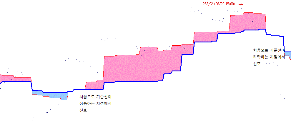 그림에서 처럼 기준선이 하락하다가 처음으로 상승하는 지점과