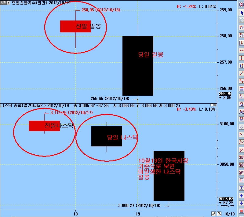과거 봉은 주종목 밑의 나스닥종합의 봉의 값을 이용해 계산하므로