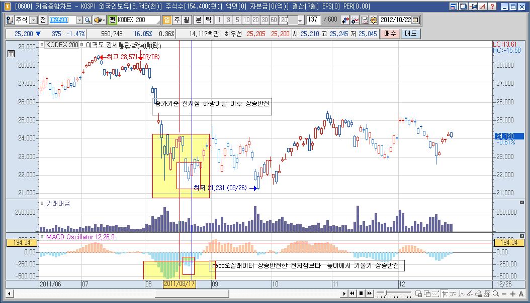 MACD오실래이터는 전저점보다 높이에서 한번더 하락이후 상승반전이 나오고,
