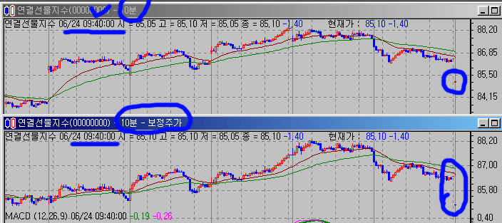 > 틱차트는 이상이 없으나 분봉에 이상이 있습니다.