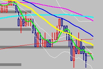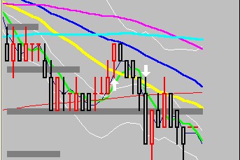 > 차트에서 캔들을 클릭하면 or가격이 실시간 면할때도,...깬들과 매물대 그림이 위로 올라와 이평선들과 시스템 신호가 뒤로 밀려나며 선이 끈기고...