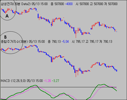이 상태에서 [차트틀]을 저장하고 새로운 차트를 열어 주 종목은 [종합주가지수]로 조회를 한 다음 해당 [차트틀]을 불러오기 하면 사용자님께서 올리신 그림처럼 주 종목은 [종합주가지수]로, 삼성전자는 참조데이타로 한 화면에 같이 표시되는 것입니다. 참조데이타나 지표, 주 종목 데이타의 위치를 변경하길 원하시면 마우스로 드레그 하여 원하는 위치에 드랍하시고 다시 [차트틀]로 저장하시면 편리하게 사용하실 수 있습니다.