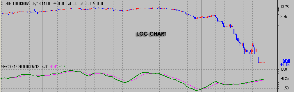 알고 계시는 바와 같이 옵션 차트에서는 로그 차트를 많이 봅니다. 그 이유는 변화된 가격이 Y축 적용을 일반으로 선택을 했을 때 낮은 가격대로 간 옵션물은 봉이 거의 판단 불가능하기 때문입니다.