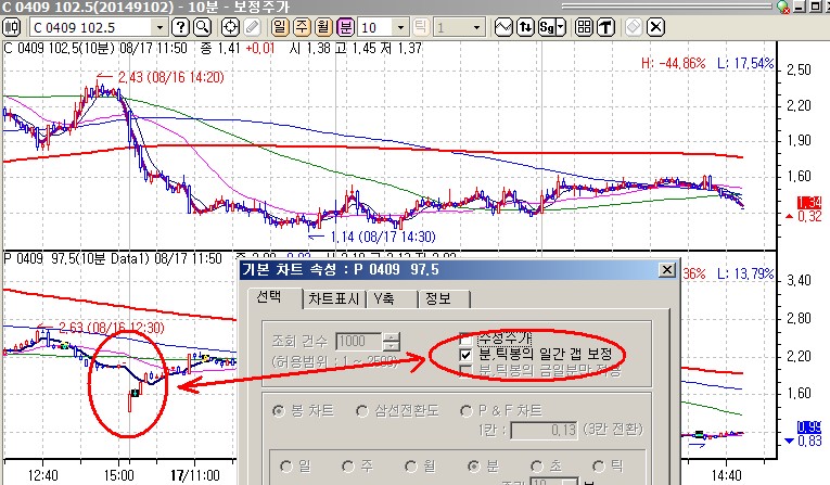 주챠트 및 보조챠트에 갭보정 기능을 설정해두면...