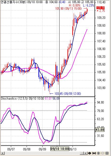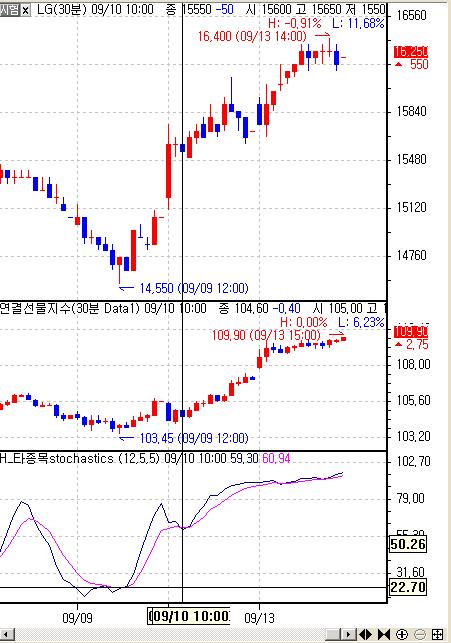 선물의 스토케스틱 데이타와 LG차트에서 타종목 참조한 선물의 스토케스틱 자료의
