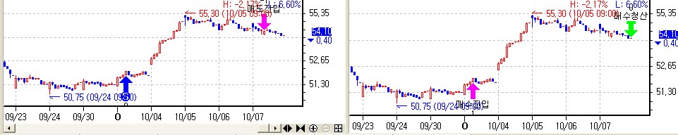 또한 신호의 표시도 주문이 나가는 시점의 봉에 표시하게 됩니다.