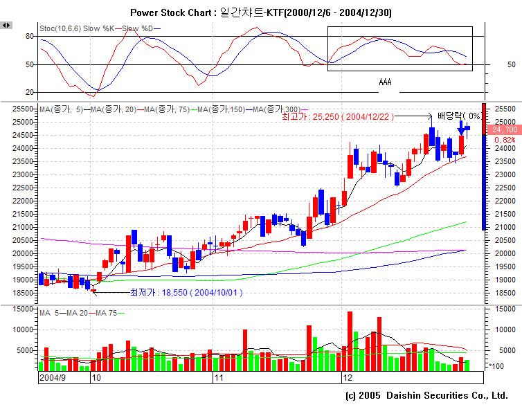 대신과 키움은 KTF 의 최근 며칠 동안 스토캐스틱에서 다이버전스가 명확히 보이는 반면,