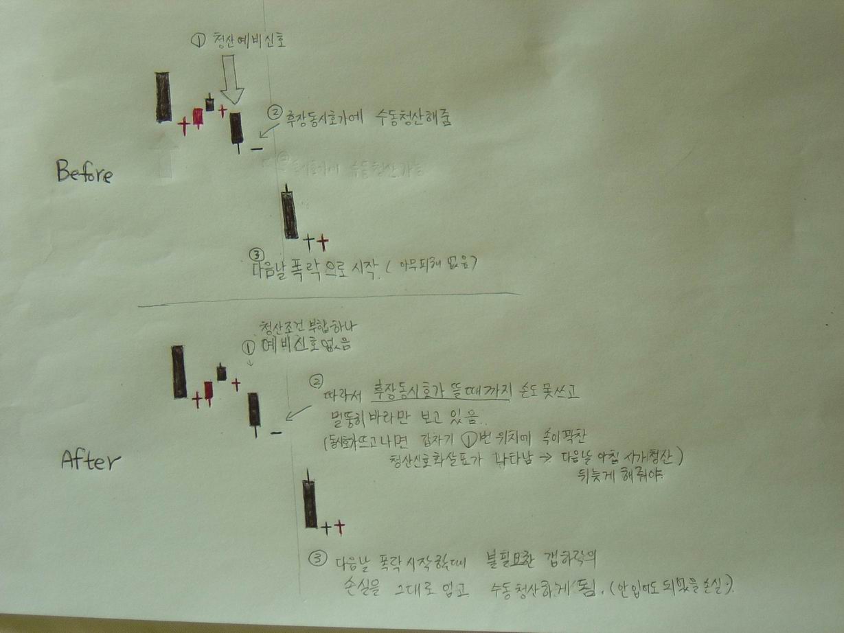 1) 새신호체계에서도 장막판 동시호가 직전봉에서(청산,손절)조건이 만족되면 바로 동시호가에서 그 위험에서 탈출 할 수 있는 방법을 알려주시던가..