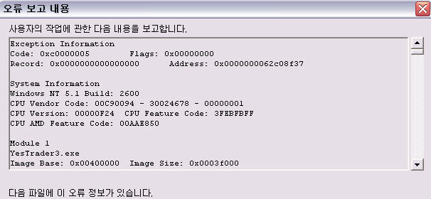 예스트레이더 프로(ver2) 에서는 같은 용량의 화면틀을 문제없이 사용해 왔으며, 참고로 저는 두 컴퓨터에 id 2개를 쓰고 있어서 다른 컴퓨터의 YT3에 이 화면틀(*.ytg)을 써본 결과 마찬가지로 멈추었으며, 그 컴퓨터의 화면틀 파일을 이쪽에 쓰는 경우에는 정상 작동합니다.