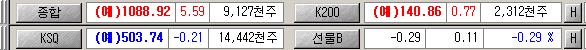 아래 그림은 증권전산시스템을 이용하는 증권사의 지수티커창입니다.