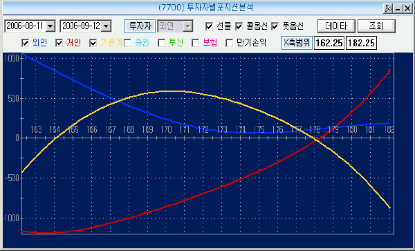 "투자 주체별 매매 현황" 화면에서 주체별 추정을 선택하면 예상손익 그래프를 보여주고 있는데...현재는 각 주체가 별도로 나옵니다. 이것을 다른 화면 처럼 각 주체를 선택할 수 있게하여 외국인, 개인, 기관계를 같이 볼 수는 없나요? 만약 현재 그런 기능이 없다면 꼭 개선바랍니다.