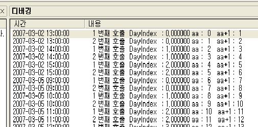 2007-03-05 10:00:00 1 번째 호출 DayIndex : 1.000000 aa : 8 aa+1 : 9
