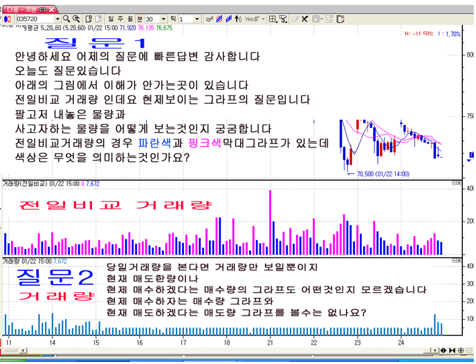 거래량(전일비교) 차트의 색상은 전봉대비 거래량이 증가하였으면 핑크색, 하락하였으면 파란색으로 나타내고 있습니다.