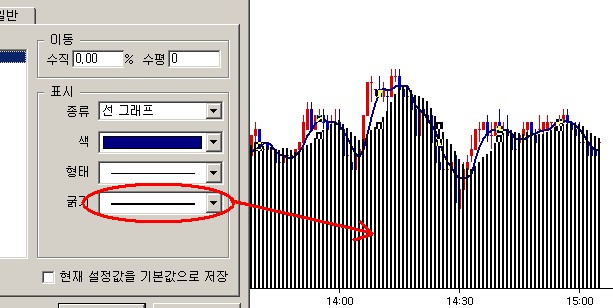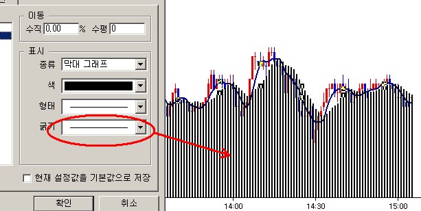 > 첨부파일 첫 번째 보시면 지표속성에서 차트표시에서 막대그래프로 굵기를 제일 가늘게 한 상태입니다. 두 번째 파일을 보시면 첫 번째 굵기와 두 번째 굵기가 같습니다.