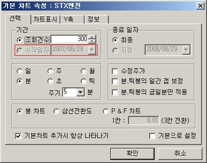 1. 기본 차트 추가시 대화상자에서 '조회기간'이 비활성입니다.(첨부 그림 참조) 원인이 뭔가요? 참고로 계좌는 정식계좌가 아닌 모의계좌입니다.