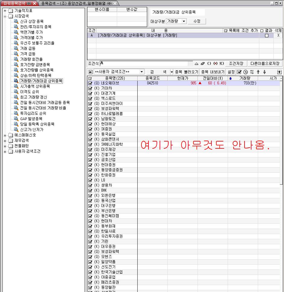 > 파워종목검색에서 검색된 종목의 세부정보(종목번호,거래량,상승률 등)이 제대로 표시되지 않습니다.