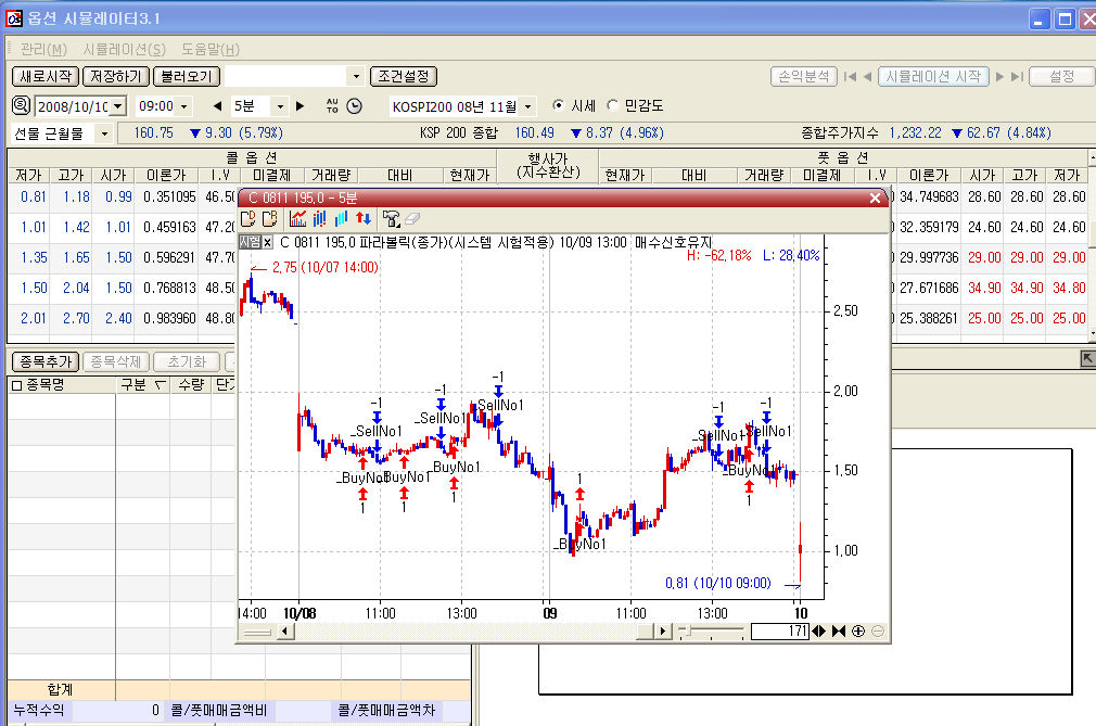 말씀하신 1번의 시스템최적화는 가능하지 않습니다. 옵션시뮬레이터의 시뮬레이션 기능은 합성전략 포지션 구성을 한 후에 시간의 경과에 따라 손익의 변화를 관찰하기 위한 것으로 일반적인 시스템트레이딩의 시뮬레이션과 기능이 서로 다릅니다.