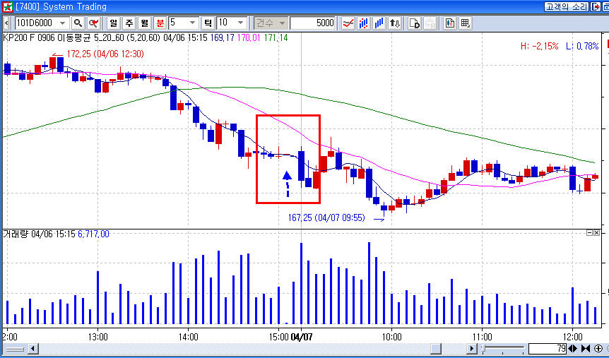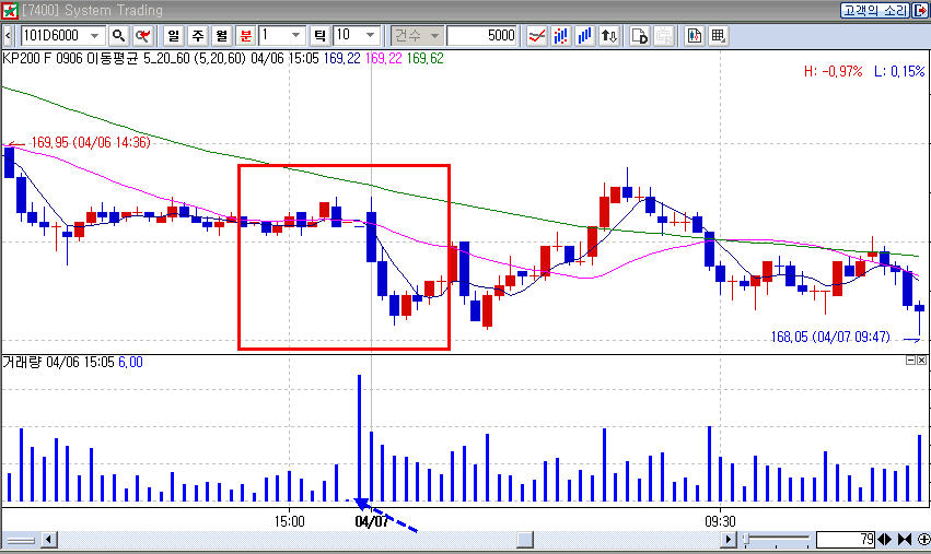 어떤 경우는 15시5분봉이 만들어지기도 하고 어떤 경우는 안 만들어지는 경우가 있는데, 이것은 증권거래소로부터 체결되어 들어오는 데이타가 어떤 경우는 15시04분59초 까지 데이타가 들어온 후 동시호가에 들어가는 경우가 있고 어떤 경우에는 15시05분00초나 01초 까지 데이타가 들어온 후 동시호가에 들어가는 경우가 생기기 때문입니다. 15시05분 이후에 체결되는 데이타에 대해서는 15시 봉에 포함시키는 것을 고려할 수도 있겠지만, 이렇게 될 경우 시간축을 기준으로 봉을 만드는 원칙이 무너지게 되고 시스템에 따라서 신호가 변경되는 경우도 생길 수 있습니다. 일반적인 HTS(시각적인 분석이 중요한)라면 합산하여 봉을 만드는 것이 별 문제가 되지 않지만, 엄격한 기준에 따라서 신호를 발생시키고 주문을 발생시키는 시스템트레이딩 툴에서는 두개의 봉을 임의로 합치기 어려운 문제가 있습니다.
