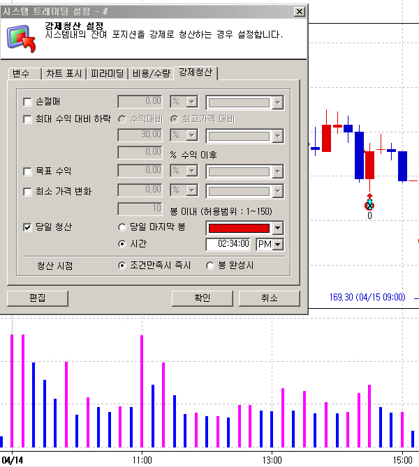 당일청산 옵션을 대부분의 데이트레이딩 전략을 사용하시는 분들이 사용하는 기능이라서 이 부분에 오류가 있을 것이라고 생각되지는 않습니다. 일단 의심스러운 것은 강제청산 시점이 '봉완성시'로 되어 있었던 것은 아닌가 하는 생각이 듭니다.