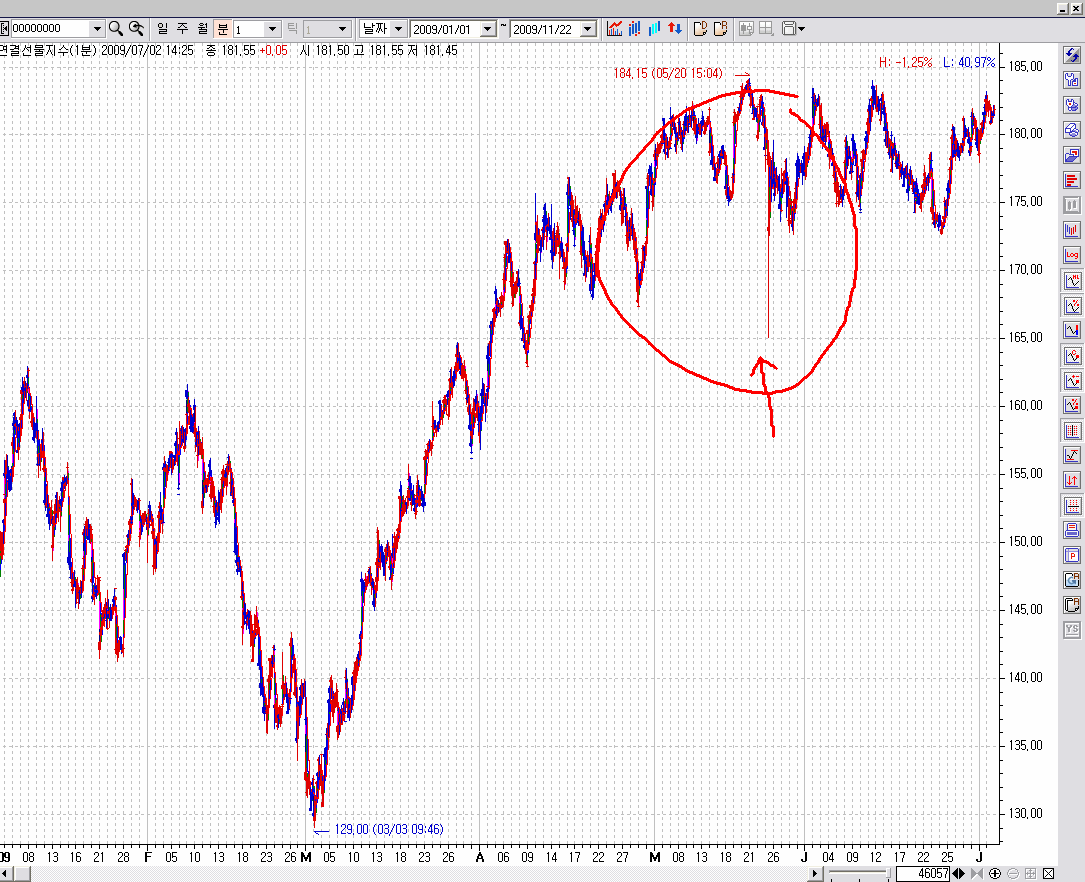 전체 축소된 2009년 차트에서는 적색봉(양봉) 꼬리로 보입니다.