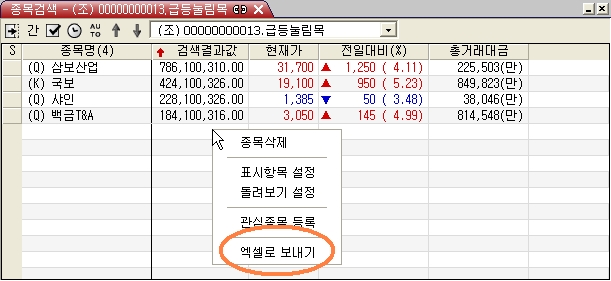 종목 검색창의 결과는 오른마우스 클릭으로 '엑셀로 보내기' 메뉴가 보이는데, 이와 비슷한 기능이 있으면 좋겠습니다.