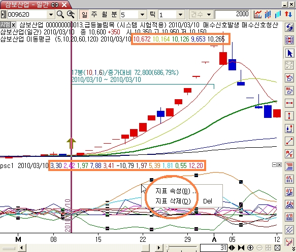첨부그림 1의 주황색 사각형 부분의 데이터 참조.(이동평균, psc1보조지표등)