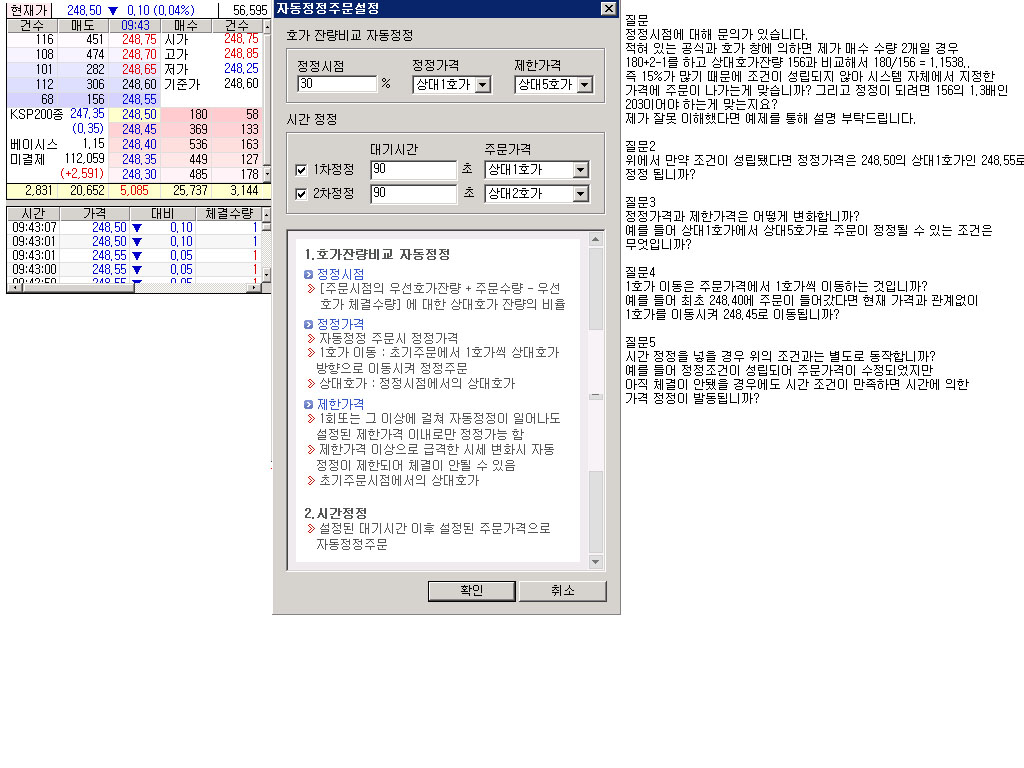 정정가격 상대1호가, 제한가격 상대5호가로 설정한 상태에서 248.50에 최초 주문이 들어갔다고 가정해보면 최초 정정주문은 248.55로 나가게 되고 만일 이 상태에서 미체결된다면 잔량을 비교하여 그 다음 정정은 248.60으로 나가게 됩니다. 이렇게 정정을 순차적으로 해 나가다가 제한가격인 248.75까지 정정주문이 나갈 수 있지만, 이 가격 이상은 제한가격에 걸려서 더이상 정정주문이 나가지 않습니다.