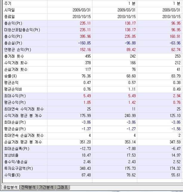 포트폴리오분석에서 종합의 승률은 수익거래횟수의 총거래횟수에 대한 백분율값입니다.