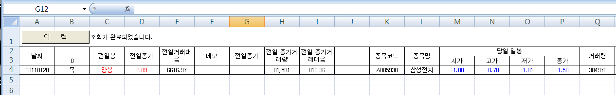 VBA를 이용해서 엑셀에 입력한 종목의 현재가,시가,고가,저가, 거래량등 기록해서